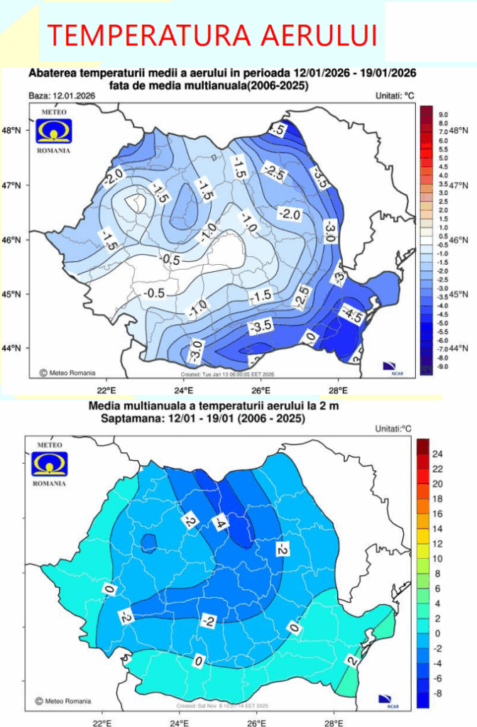 Administrația Națională de Meteorologie informează că, raportat la media multianuală din perioada 2005 – 2026, săptămâna aceasta, temperatura va fi mai scăzută decât în mod normal, în cea mai mare parte a țării. Cele mai reduse valori termice vor fi în nord-est, est și de sud-est. În vestul și sud-vestul țării precipitațiile vor fi deficitare.