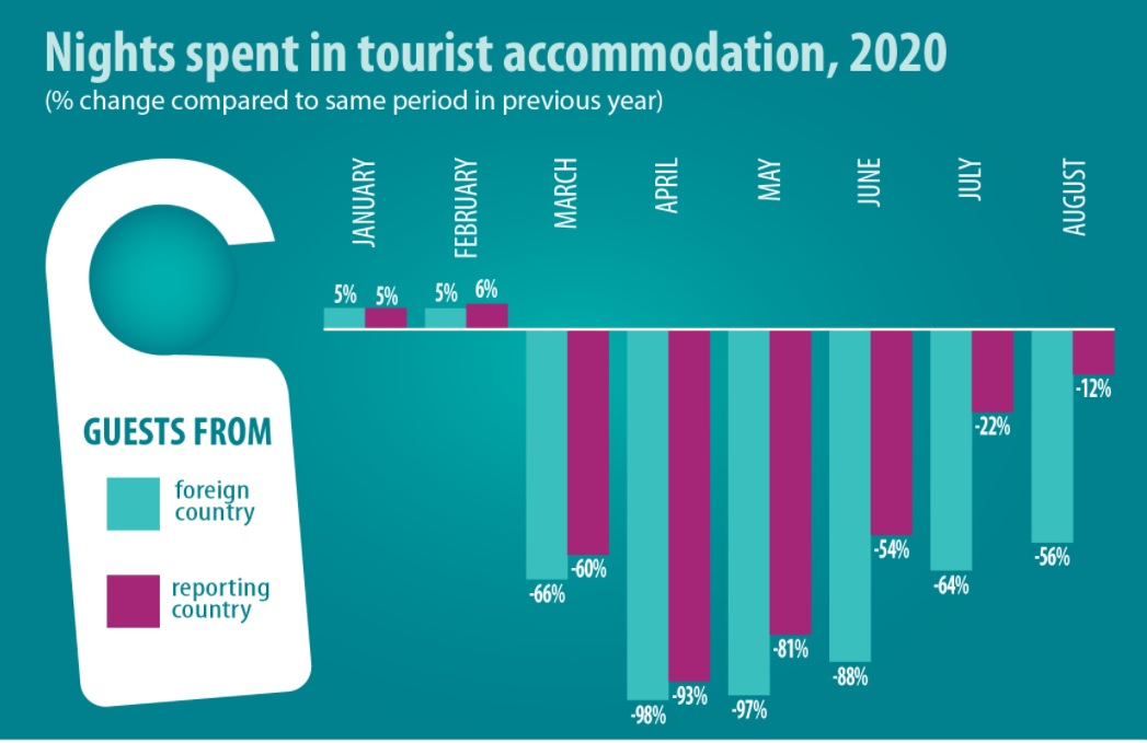 În 2020, industria turismului a avut de suferit pe fondul pandemiei COVID-19 și, deși în lunile de vară s-a constatat o revenire ușoară, per total nivelul a rămas pe minus. Eurostat a comparat cifrele privind cazarea în unitățile de profil din 2020 cu nivelul din 2019: