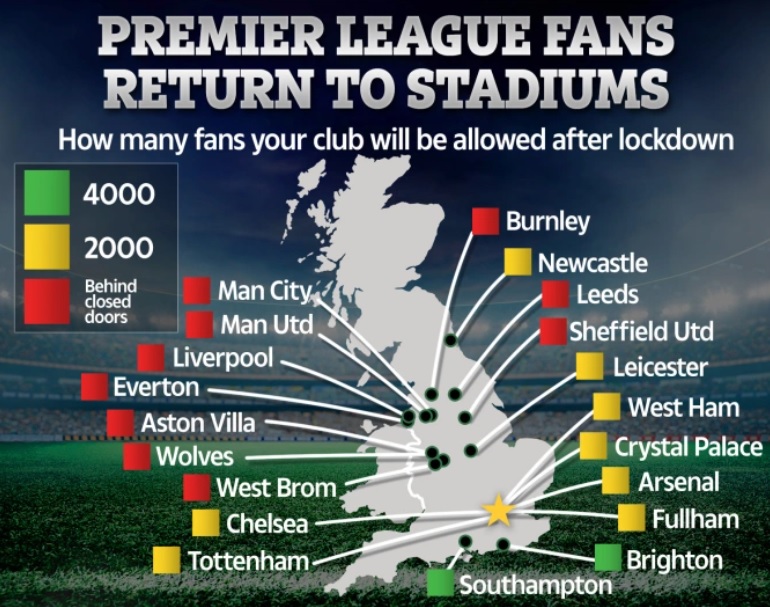 De exemplu, în zonele cu cel mai mic nivel de risc de răspândire SARS-CoV-2, la meciurile din Premier League va putea asista un număr de fani de cel mult 50% din capacitatea stadionului, dar nu mai mare de patru mii. Situație similară și în zonele cu nivel mediu de risc, dar numărul maxim de fani nu va putea depăși două mii.