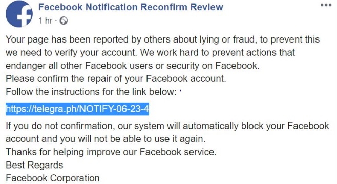 CERT-RO atrage atenția că paginile respective sunt foarte asemănătoare, atât vizual, cât și la nivel de construcție, cu o pagină Facebook autentică. Prin intermediul unei postări pe pagină, „victima” este informată că i-a fost blocat contul, pentru distribuirea de informații false sau fraudă.