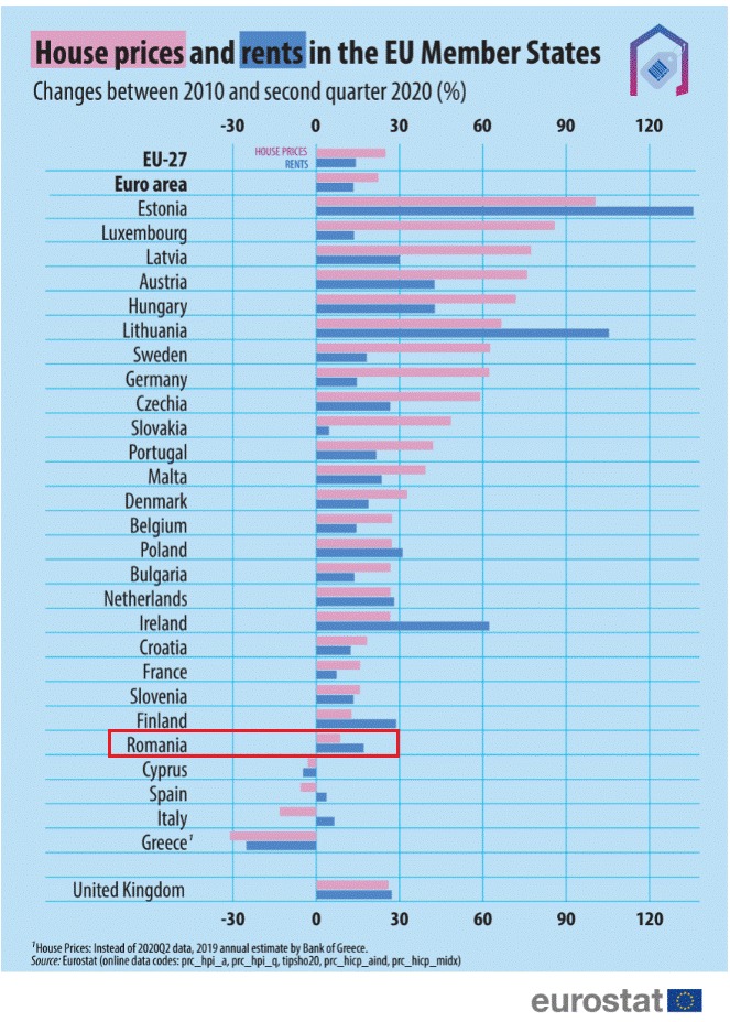 Cele mai mari creșteri ale prețurilor locuințelor au fost în Estonia (+100,5%), Luxemburg (+85,8%), Letonia (+77,3%) și Austria (+75,9%). Sunt și țări în care prețurile au scăzut, precum Grecia (-31,0%), Italia (-13,2%), Spania (-5,6%) și Cipru (-3,0%).
