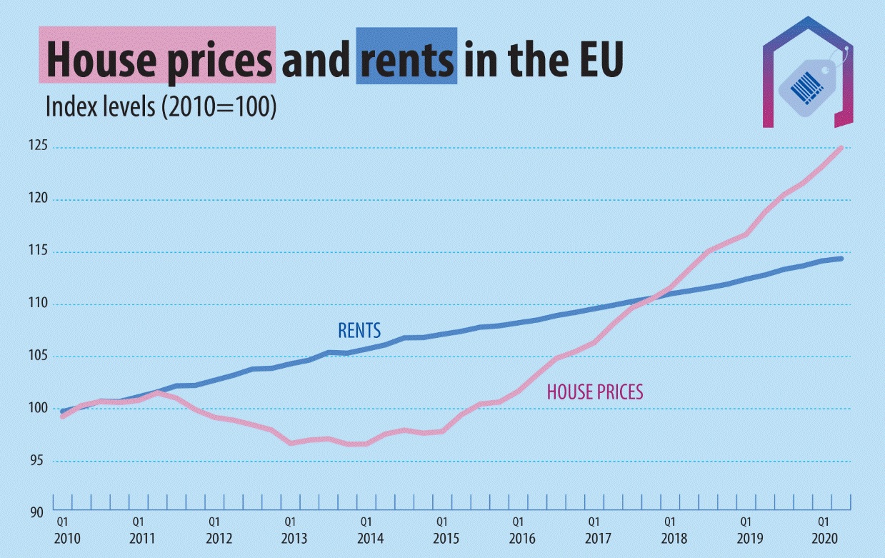 Între 2010 și al doilea trimestru al anului 2011, prețurile locuințelor și chiriile din statele Uniunii Europene s-au menținut paralele. Ulterior, începând cu finalul anului 2011, acestea au urmat căi foarte diferite: în timp ce chiriile au crescut constant pe toată perioada până în al doilea trimestru al anului 2020, prețurile locuințelor au fluctuat semnificativ.