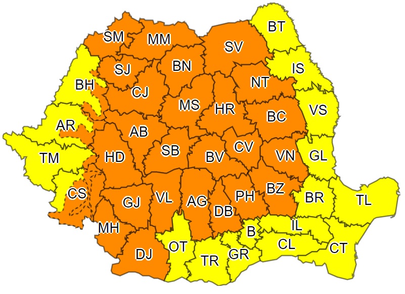 Administrația Națională de Meteorologie a emis o avertizare Cod Portocaliu de vreme severă, valabilă de sâmbătă (26 septembrie), ora 09 până duminică (27 septembrie) la ora 03. În zona de munte, precum și în Maramureș, Transilvania și local în Oltenia, Muntenia și Moldova, va ploua abundent și vor fi intervale în care se vor semnala manifestări de instabilitate atmosferică accentuată (vijelii puternice, grindină și frecvente descărcări electrice). Cantitățile de apă vor depăși 50-60 l/mp și izolat 70-90 l/mp.