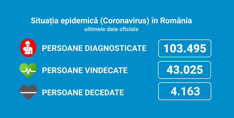 Până astăzi, 13 septembrie, pe teritoriul României, au fost confirmate 103.495 de  cazuri de persoane infectate cu noul coronavirus (COVID – 19).