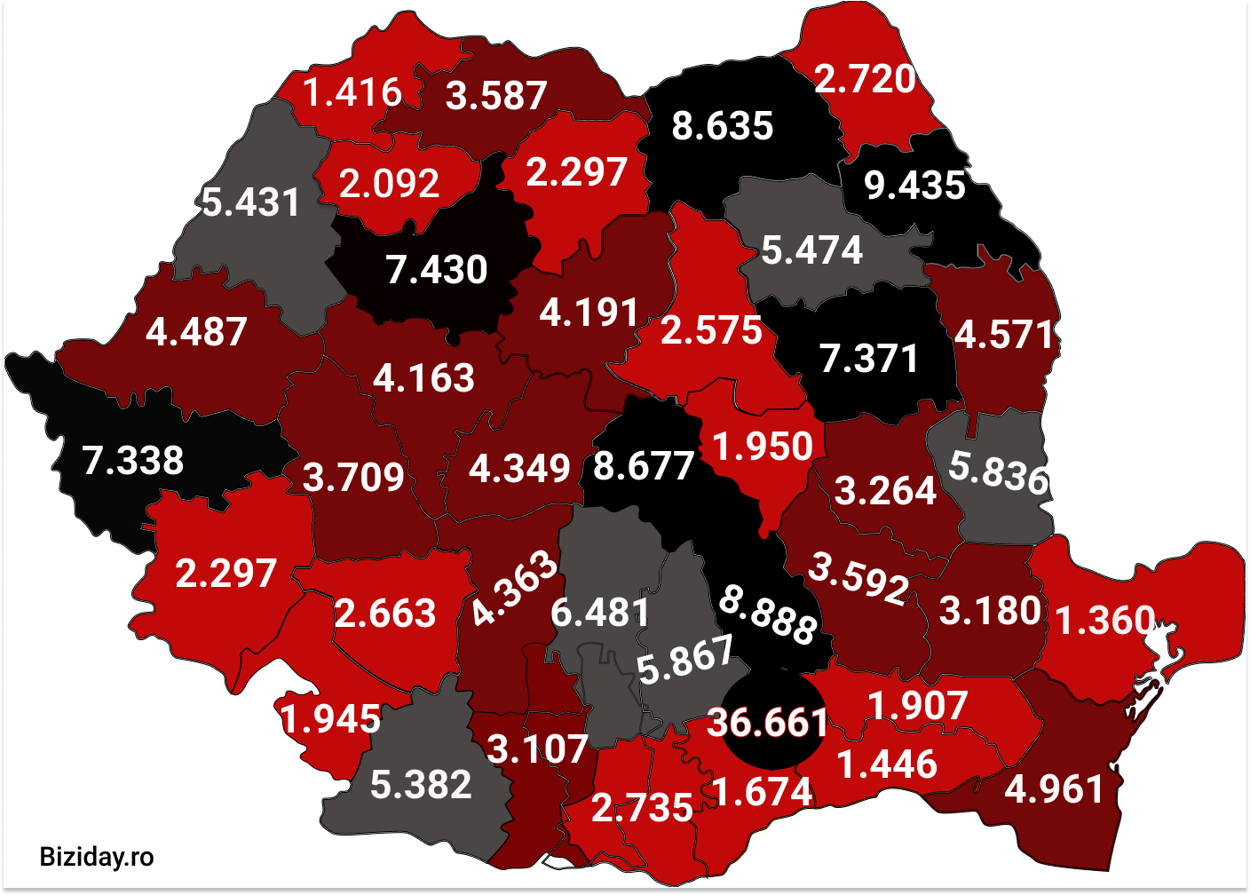 Coeficientul infectărilor cumulate la 14 zile, raportate la 1.000 de locuitori, calculat de către Direcțiile de Sănătate Publică, la nivelul Municipiului București și al județelor este următorul: