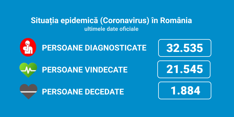 Până astăzi, 12 iulie, pe teritoriul României, au fost confirmate 32.535 de cazuri de persoane infectate cu noul coronavirus (COVID – 19). Dintre persoanele confirmate pozitiv, 23.387 au fost externate, dintre care 21.545 de pacienți vindecați și 1.842 de pacienți asimptomatici, externați la 10 zile după depistare.