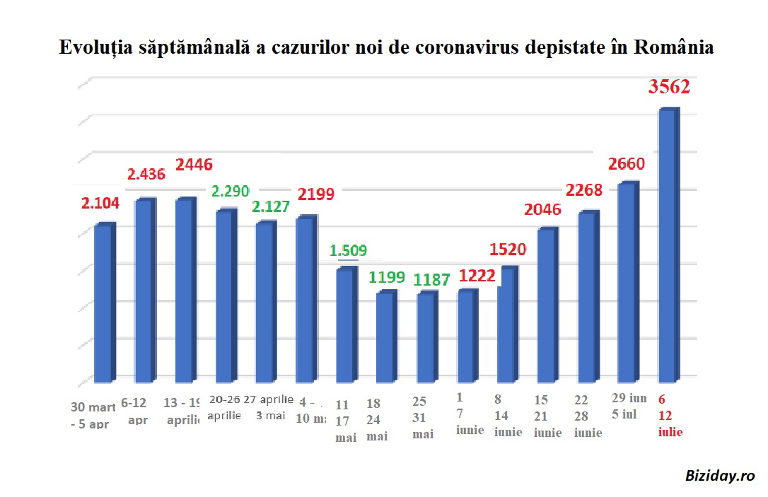 Numărul cazurilor raportate în această săptămână este cel mai mare de la începutul pandemiei în România. În această săptămână au fost raportate în total 3562 de cazuri, peste nivelul maxim înregistrat săptămâna trecută (28 iunie – 5 iulie), de 2.660 de cazuri.
