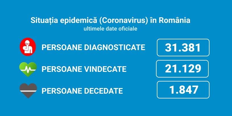 Până astăzi, 10 iulie, pe teritoriul României, au fost confirmate 31.381 de cazuri de persoane infectate cu noul coronavirus (COVID – 19). Dintre persoanele confirmate pozitiv, 22.812 au fost externate, dintre care 21.129 de pacienți vindecați și 1.683 de pacienți asimptomatici, externați la 10 zile după depistare.