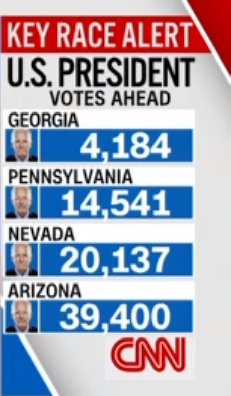 În cazul în care își păstrează avantajul doar în Pennsylvania, Biden strânge numărul minim de electori pentru a câștiga cursa prezidenția. Biden conduce acum în toate cele patru state în care numărătoare nu s-a încheiat.