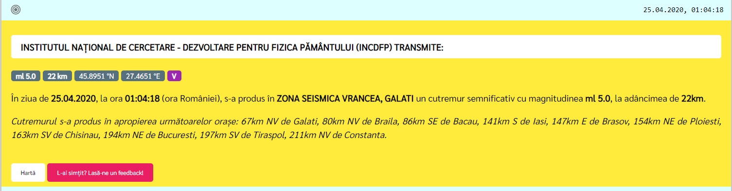 Un cutremur de suprafață s-a produs sâmbătă la ora 1:04 în zona seismică Vrancea, Galați. INFP arată că seismul s-a simțit și în Brăila, Bacău și Iași. Din primele informații nu au existat replici.
