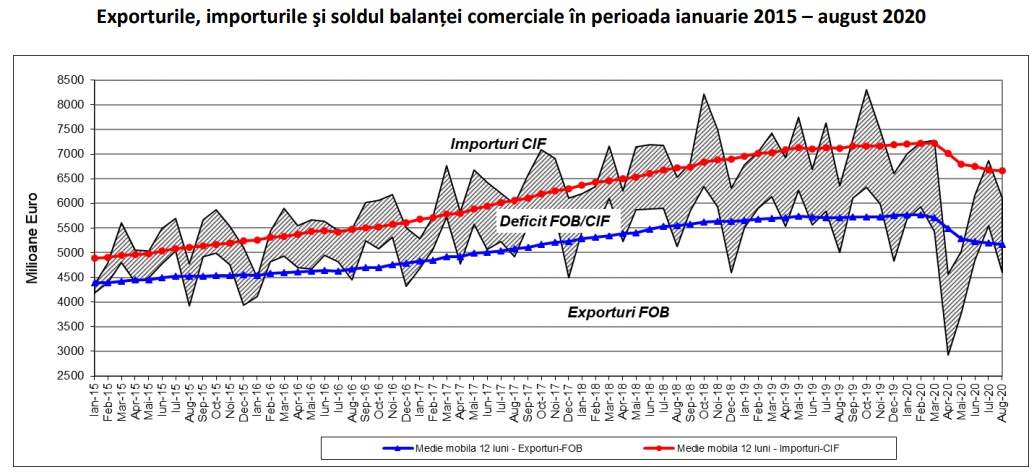 - În luna august 2020, exporturile României au însumat 4,6 miliarde de euro, iar importurile 6,1 miliarde de euro, rezultând un deficit lunar de 1,5 miliarde de euro. Faţă de luna august din 2019, exporturile din luna august 2020 au scăzut cu 8%, dar importurile au scăzut cu numai 3,9%.