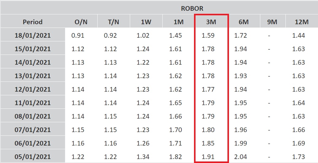 Indicele ROBOR la 3 luni, în funcție de care sunt calculate dobânzile la majoritatea creditelor în lei, a ajuns luni la 1,59%, în condițiile în care a scăzut constant în ultimele săptămâni. ROBOR la 6 luni a coborât de la 1,94% la 1,72%.