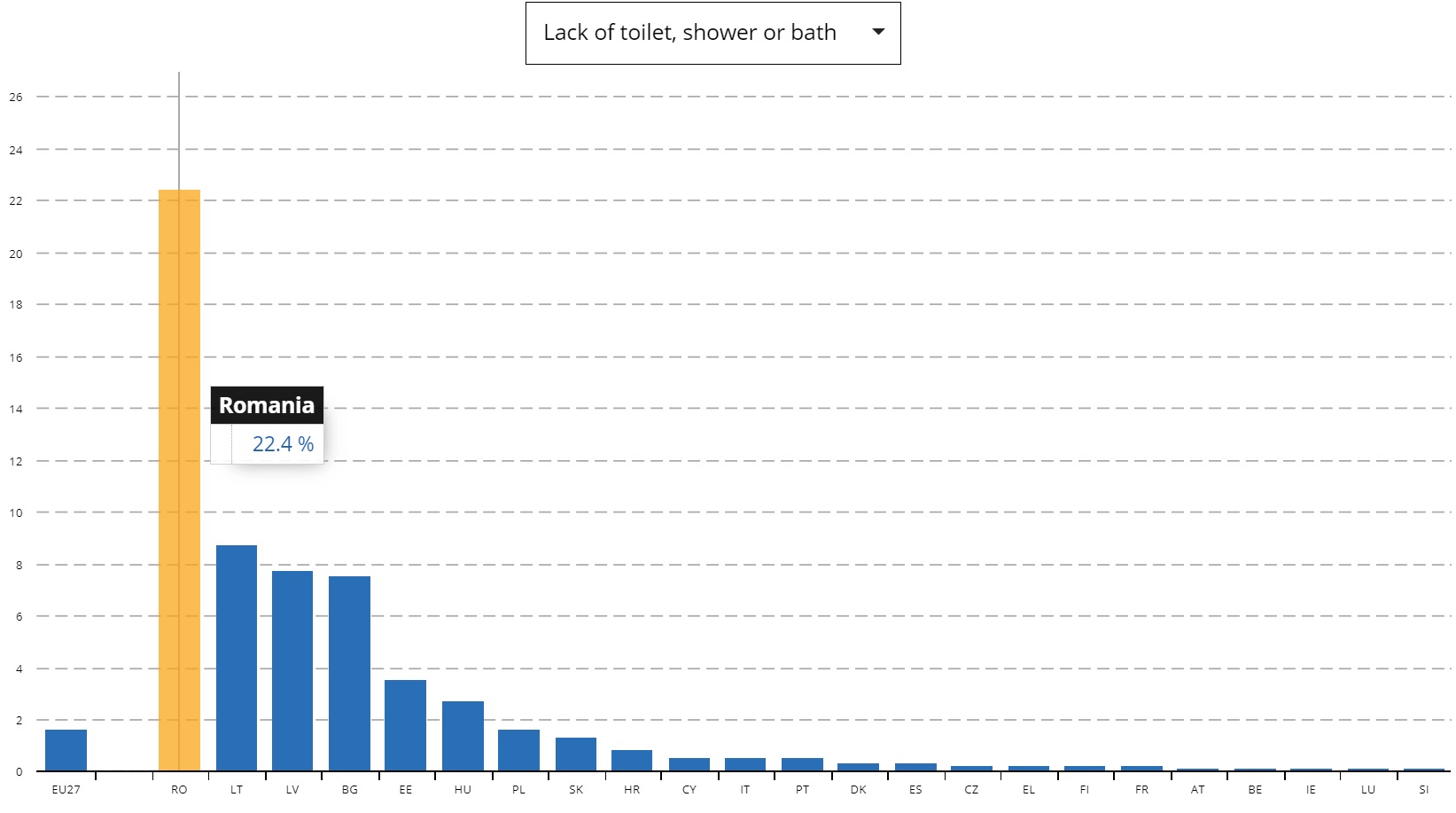 Mai exact, 22,4% din populația României încă are toaletă în curte, mult mai mult decât oricare altă țară europeană. Nici în Bulgaria sau Lituania acest procent nu depășește 10%, iar media Europei de Vest este de sub 0,5%.