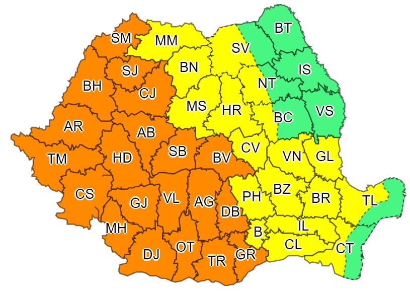 Administrația Națională de Meteorologie a emis o nouă avertizare tip Cod Portocaliu de ploi și furtuni în jumătatea vestică, de luni (15 iunie), ora 13.00, până marți (16 iunie) la ora 03 dimineața.