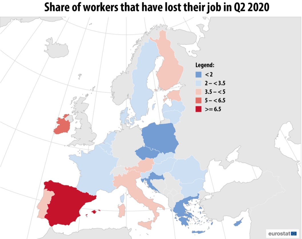 Eurostat precizează că în general persoanele cu venituri reduse, inclusiv cele aflate sub pragul de risc al sărăciei, sunt mai susceptibile să fie disponibilizate temporar sau să-și piardă locul de muncă. Muncitorii tineri, slab calificați și din sectorul cazării și alimentației sunt adesea suprareprezentați în grupurile cu venituri mici din multe țări și, prin urmare, prezintă un risc mai mare.