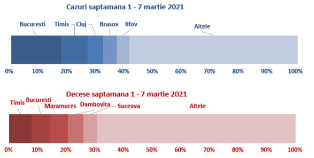 În intervalul determinat, Institutul Național de Sănătate Publică (INSP) a mai precizat că 41.1% din totalul cazurilor s-au înregistrat în București, Timiș, Cluj, Brașov și Ilfov. Totodată, o treime din totalul deceselor au fost înregistrate in Timiș, București, Maramureș, Dâmbovița si Suceava.