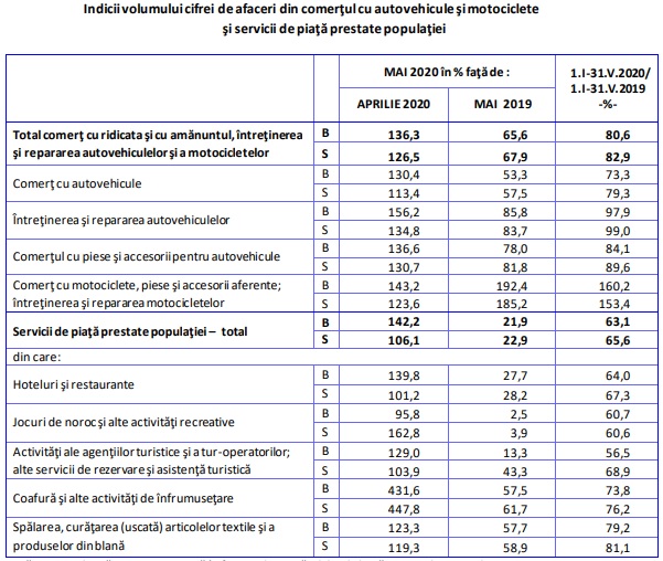 Comerțul cu autovehicule a crescut cu peste 36% în mai, față de luna aprilie, ajutat de sectorul de întreţinere şi reparare a autovehiculelor (+56%). Cu toate acestea, nivelul este cu 34% sub nivelul de anul trecut.