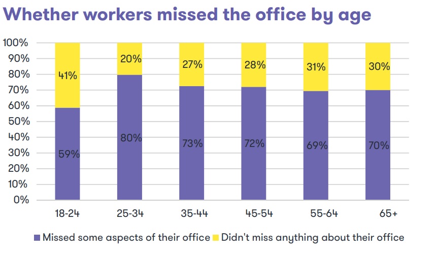 Studiul mai arată că cei mai tineri (18-24 de ani, nu intră în categoria milenialilor), aflați la început de drum, preferă chiar mai mult decât generația anterioară să nu meargă la birou și să lucreze astfel de acasă. Doar 59% dintre aceștia spun că le lipsește “biroul de la locul de muncă”, față de 80% în rândul generației milenialilor.