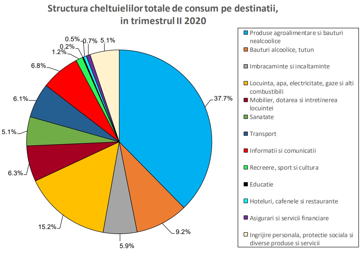 Românii au cheltuit cel mai mult pe produse alimentare (37,7%), facturile pentru utilități (15,2%) și băuturi alcoolice și tutun (9,2%). Ponderea cea mai mică în structura cheltuielilor unei familii o au educația (0,2%), banii alocați pentru hoteluri, restaurante și cafenele (0,5%), asigurări și servicii financiare (0,7%) și recreere, sport și cultură (1,2%)