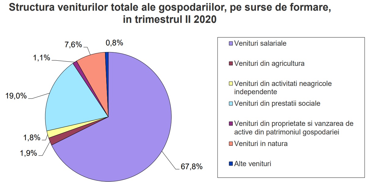Veniturile medii lunare ale gospodăriilor, în al doilea trimestru, au fost de 5.077 lei. Venitul lunar pe persoană a fost de 1.973 de lei, peste nivelul din trimestrul II 2019, de 1.838 lei pe persoană.