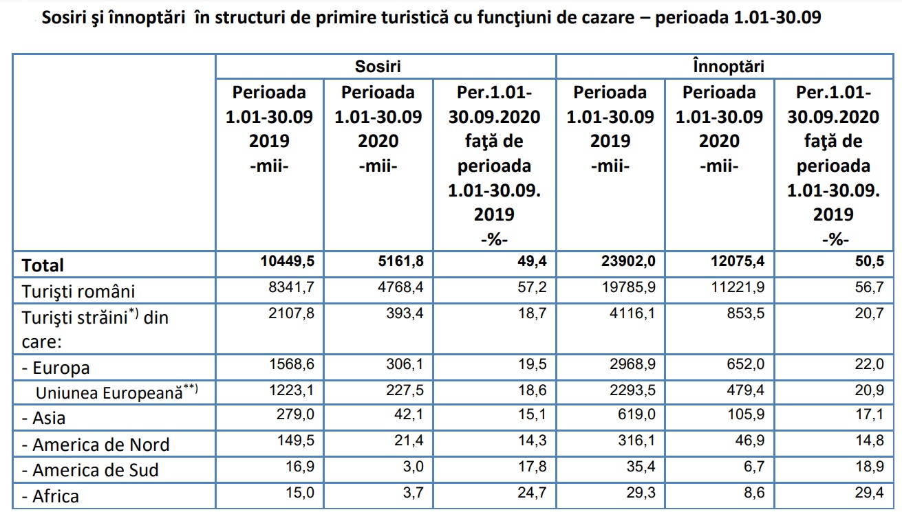 • În luna septembrie 2020, când încă erau aproape în totalitate relaxate restricțiile, sosirile (795 de mii) în structurile de primire turistică cu funcţiuni de cazare au scăzut cu 39,5%, iar înnoptarile (1,9 milioane) au scăzut cu 36,9%, față de aceeași lună din 2019. Sosirile turiştilor români în structurile de primire turistică cu funcţiuni de cazare au reprezentat 95,9%, în timp ce turiştii străini au reprezentat 4,1%.